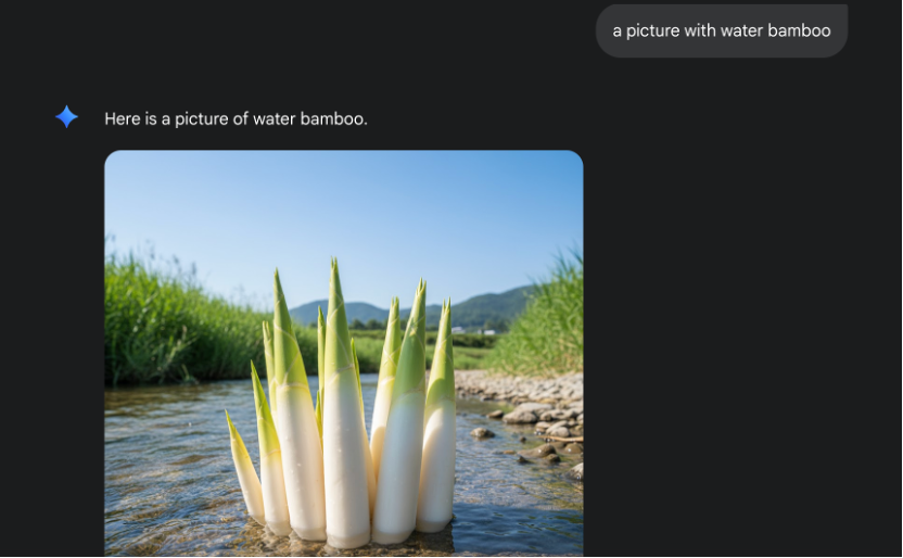 上文提到的神秘茭筍和神奇H?O分子,由于過于幽默,輿論擴(kuò)散后已經(jīng)被連夜撤下。但我還是不死心,茭筍這么神奇的新物種是怎么制造出來的?在我打算用Gemini復(fù)現(xiàn)一下這張AI圖時(shí),突然想起來,茭白是中國的本土物種,國外不常見,而茭白的英文翻譯是:water bamboo。于是我讓G老師幫我生成一張water bamboo的圖片, 一下子,我頓悟了,甚至感覺自己找到了山姆最愛的那條河。