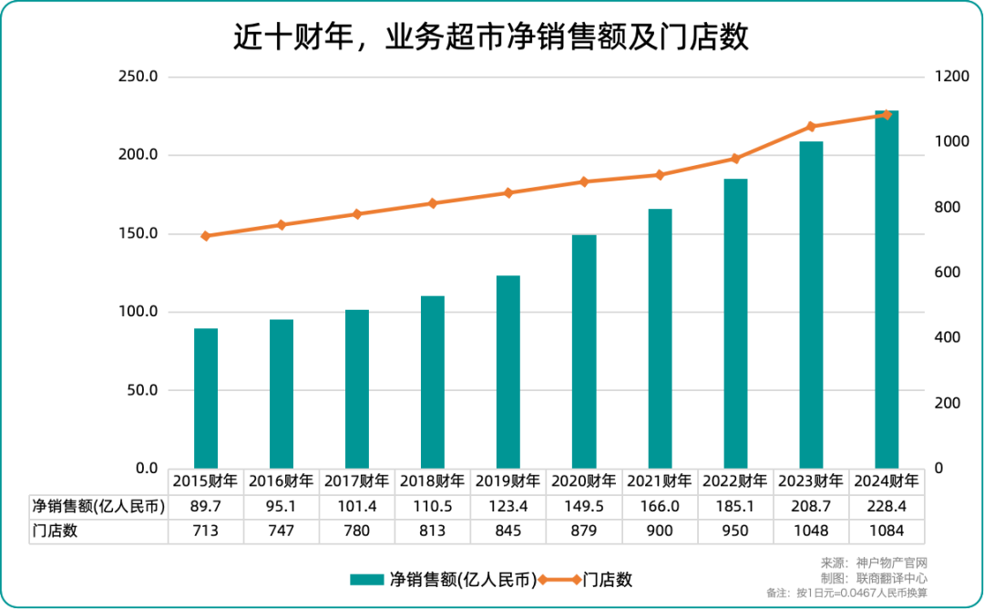 聯(lián)商網(wǎng)統(tǒng)計發(fā)現(xiàn),在2015-2024財年間,業(yè)務超市凈銷售額累計增長154.7%,年均復合增長率約為10.9%,且增長勢頭依舊強勁,占神戶物產(chǎn)總銷售額的90%以上;門店總數(shù)從713家增長至1084家,十年凈增371家,年均新增約37家門店,擴張節(jié)奏穩(wěn)健。